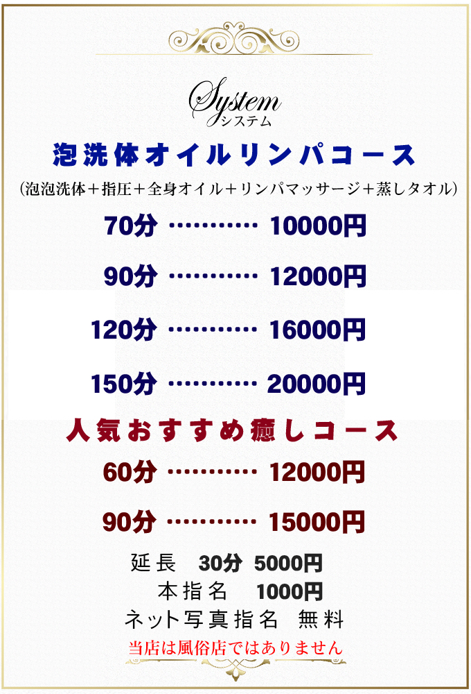 当店は性風俗的サービスは一切ございません。以下の行為を禁止します。 1 ヌキサービス、手コキ、パンチラ、売春、本番行為、その他性的サービスを強制・強要行為 2 セラピストの身体へのタッチ、嫌がる言葉や行為、デートの誘い・ストーカー 3 同業者・暴力団の方の入店 禁止事項違反・苦情があった場合ふさわしくないと判断した場合は、 即刻停止し、身分証提出・入店禁止・返金不可とします。